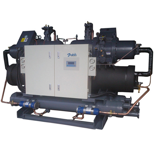 螺桿式冷水機因其關鍵部件壓縮機采用螺桿故名螺桿冷水機,機組由蒸發器出來的狀態為氣體的冷媒;經壓縮機絕熱壓縮以后,變成高溫高壓狀態。被壓縮后的氣體冷媒,在冷凝器中,等壓冷卻冷凝,經冷凝后變化成液態冷媒,再經節流閥膨脹到低壓,變成氣液混合物。